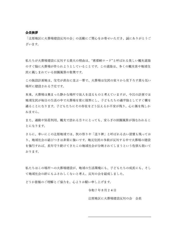 辻原地区に火葬場建設反対の会 代表 荻野智久